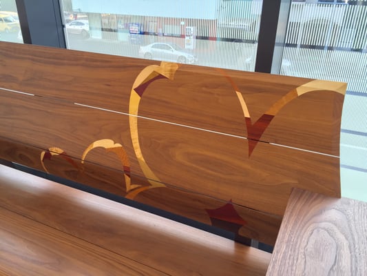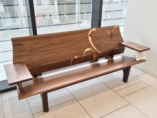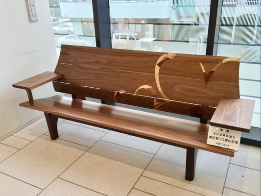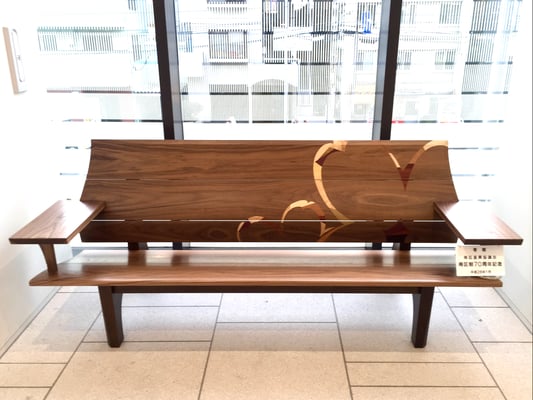 背もたれ・座面・ひじ掛けはウォールナット無垢材で背もたれには桜をモチーフにした木象嵌を施してあります。